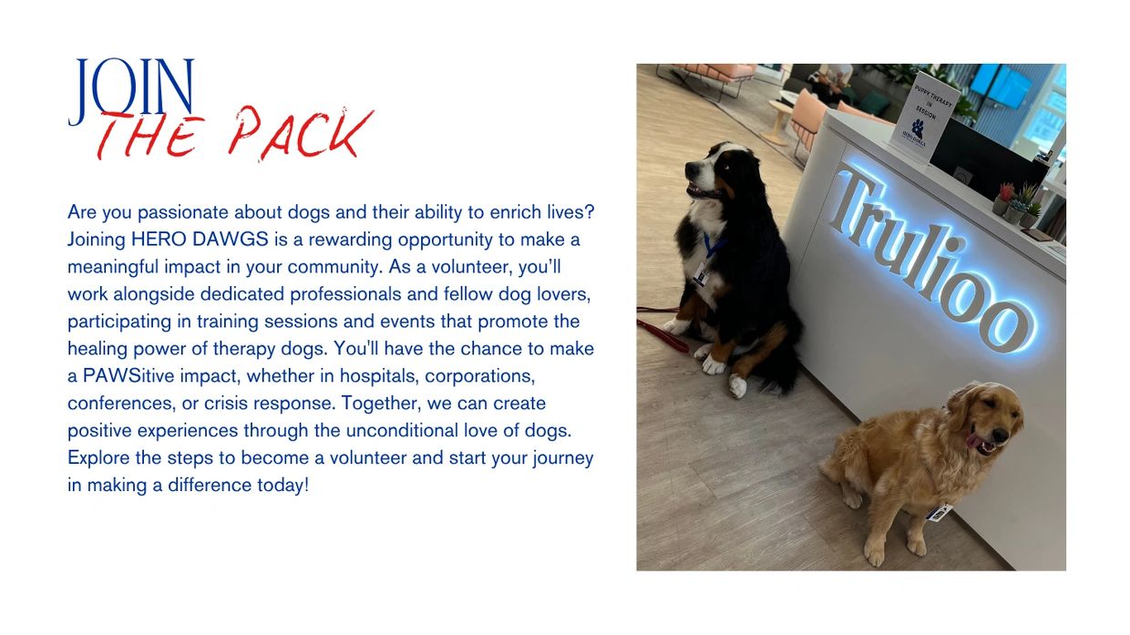 Any dog can become a HERO DAWG! Successful pack members have advanced obedience training, are well behaved, respond to their handler, can navigate uncomfortable environments, and have loads of love to give!
